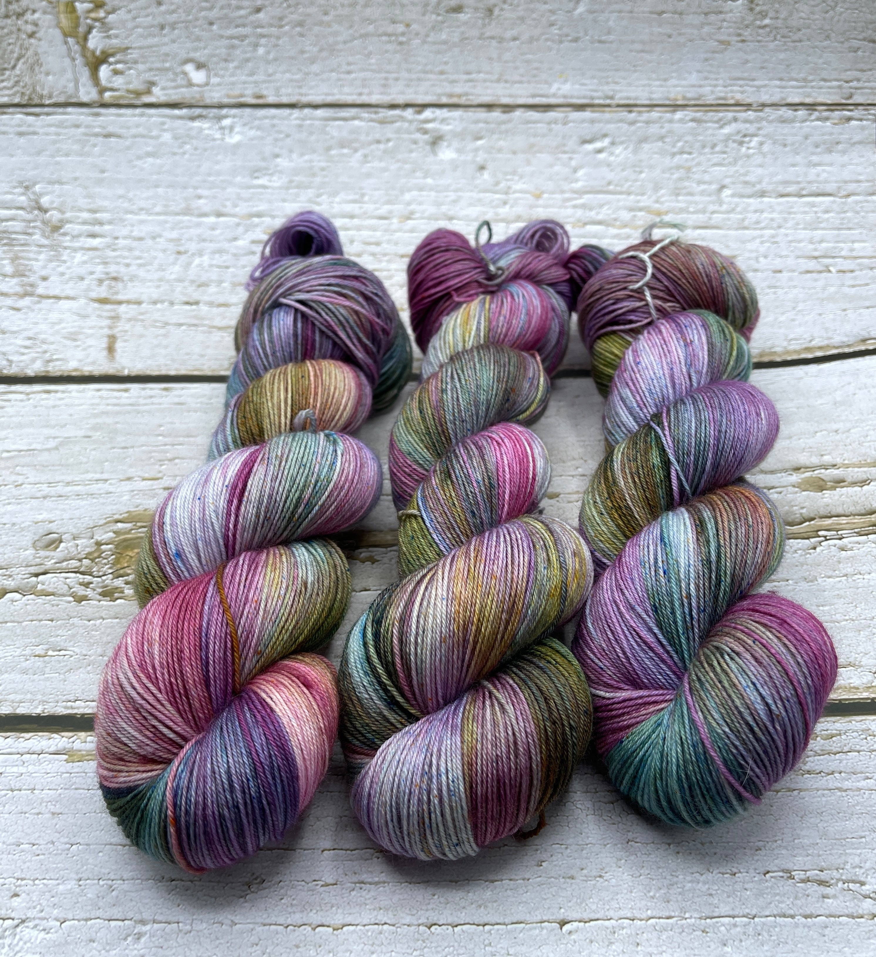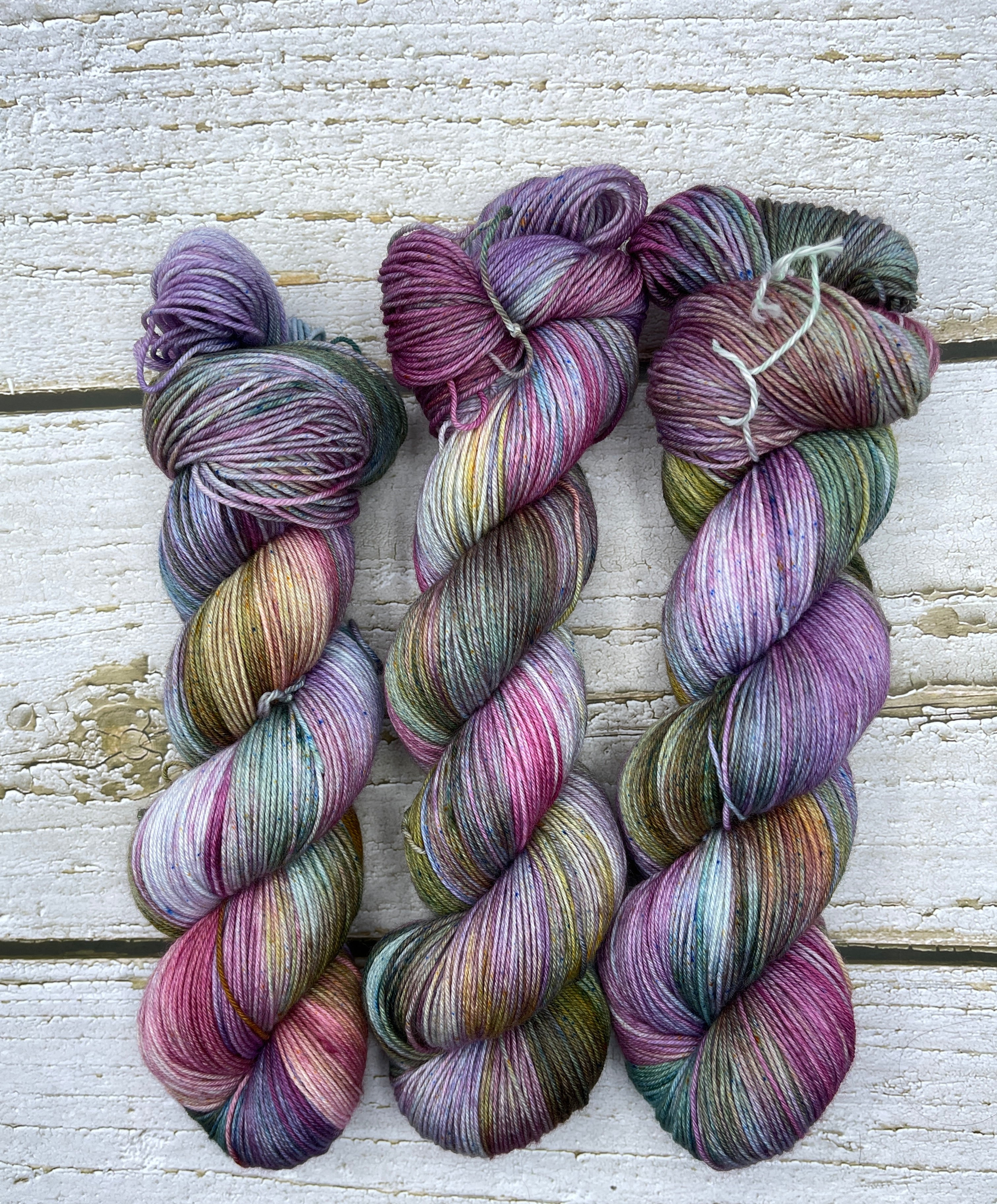 Gumdrops is a beautiful multi-colored hand dyed yarn with blues, greens, pinks, purples and golden colors. Available on the following bases: