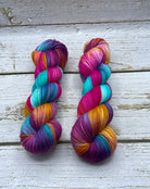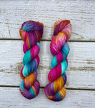 Jester's Jamboree Hand Dyed Yarn is the magic of a circus, the laughter of a Jester and the sparkle of a carnival all captured in a single skein of yarn. Knit or Crochet exquisite scarves, playful hats or dazzling shawls that are the whimsy and merriment of a jester's performance. Deep Plum, Magenta, Gold and Aqua together creates a symphony of color that is as vibrant as a jester's costume. Available on the following bases: